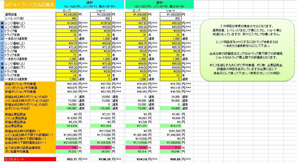 メインレンジの外ではトラップの一本辺りの通貨数を減らしたり、トラップ密度を広めに設定したりした時にM2Jの試算表では対応できなかったのでこの試算表があれば自由な設定が確認できますね^^
