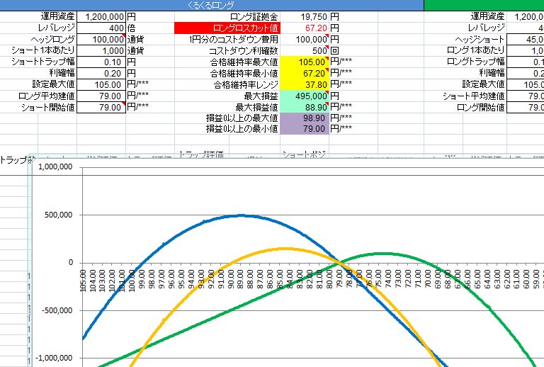 トラップの回転率は落ちますが0.2円刻みにしました。というのもオージー円の最高値~最安値+α分で維持率100%を割らない(もしくは割りにくい)ことを考えた時にトラップ幅0.1円ですとちょっと無理がある気がしたんです。設定触りまくっても最高値の安全維持率を105円にするのが難しかった。。