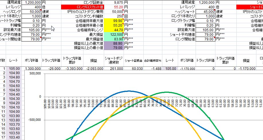 さて、安全維持率レートが106~52円になりました。一応この段階で過去最高値から最安値までカバーしながらトラップを重ねる状態になりました。試算表でやってもらうとして、レートが79円に戻った時に相殺損益も70万なので全決済という手もあります。