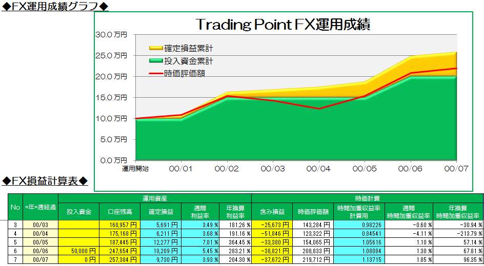 仮勘定の運用はTradingPoint以外でも行っており、そちらはもっと大きな運用資産でトラップやうねり取りの建玉の割合(運用資産に対する割合です)を少なめにした波乗りトラリピでゆったりと行っています。当然TradingPointよりも建玉自体は大きいので数万通貨ずつ・・・といった感じになってますが。